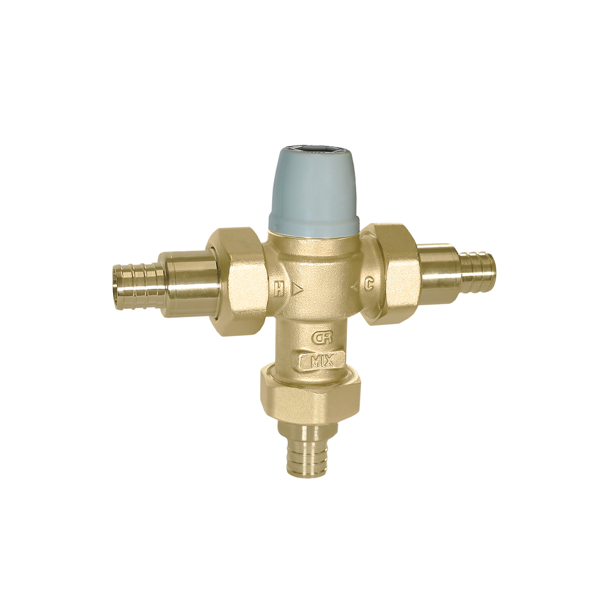 connection: 3/4" PEX expansion, union. Maximum operating pressure: 150 psi. Adjustment temperature range: 85 – 120 °F. Maximum inlet temperature: 185 °F. Flow rate working range: 0.5 – 9 gpm. Cv: 2. Material: DZR low lead brass.
