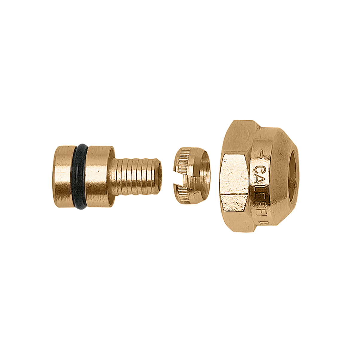 CALEFFI, 591402. Raccord pour tube plastique. Raccord entrée: G 1/2" (ISO 228-1) F, raccord. Raccord sortie: Øintérieur 10, Øextérieur 12, bicône.